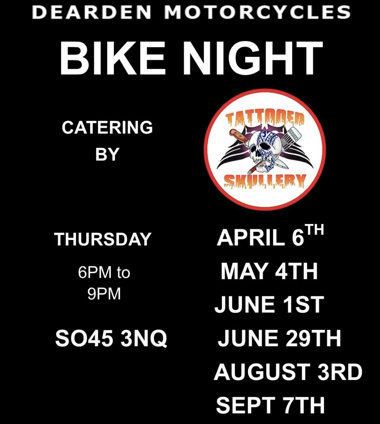 Bike Nights at Dearden Motorcycles. Dearden Motorcycles in Hythe, Hampshire are delighted to announce they will be hosting Bike Nights on Thursday evenings. Once a Month from 6th April 2023. See dates above. There will be food and refreshments. Jeremy Webb1 March 2023dearden motorcycles, hythe, hampshire, bsa, moto guzzi, suzuki, zontes, mutt, vespa, aprilia, piaggio, motorcycles, motorbikes, bike nights, food, roadtestsandreviews.co.uk, www.roadtestsandreviews.co.ukComment Facebook0 Twitter LinkedIn0 0 Likes
