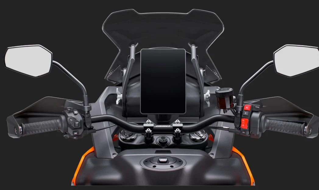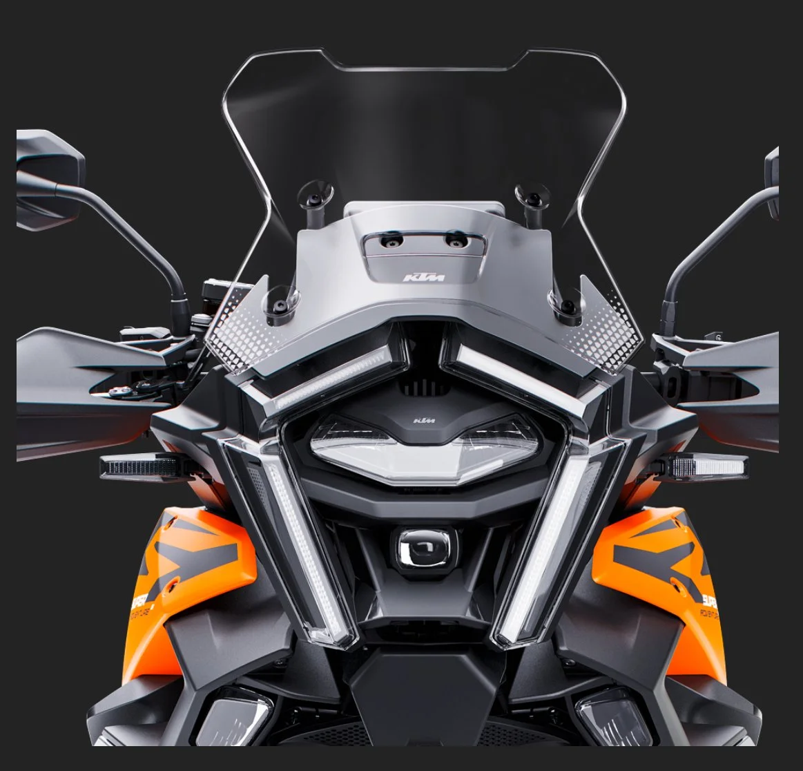 The 1390 Super Adventure S Evo is equipped with the latest fifth-generation radar sensor and Adaptive Cruise Control, developed in partnership with Bosch. This advanced system includes a range of features—from a straightforward distance warning to a Stop & Go function that can bring the bike to a halt if the vehicle in front stops. If the stop lasts less than three seconds, the bike will automatically resume movement.